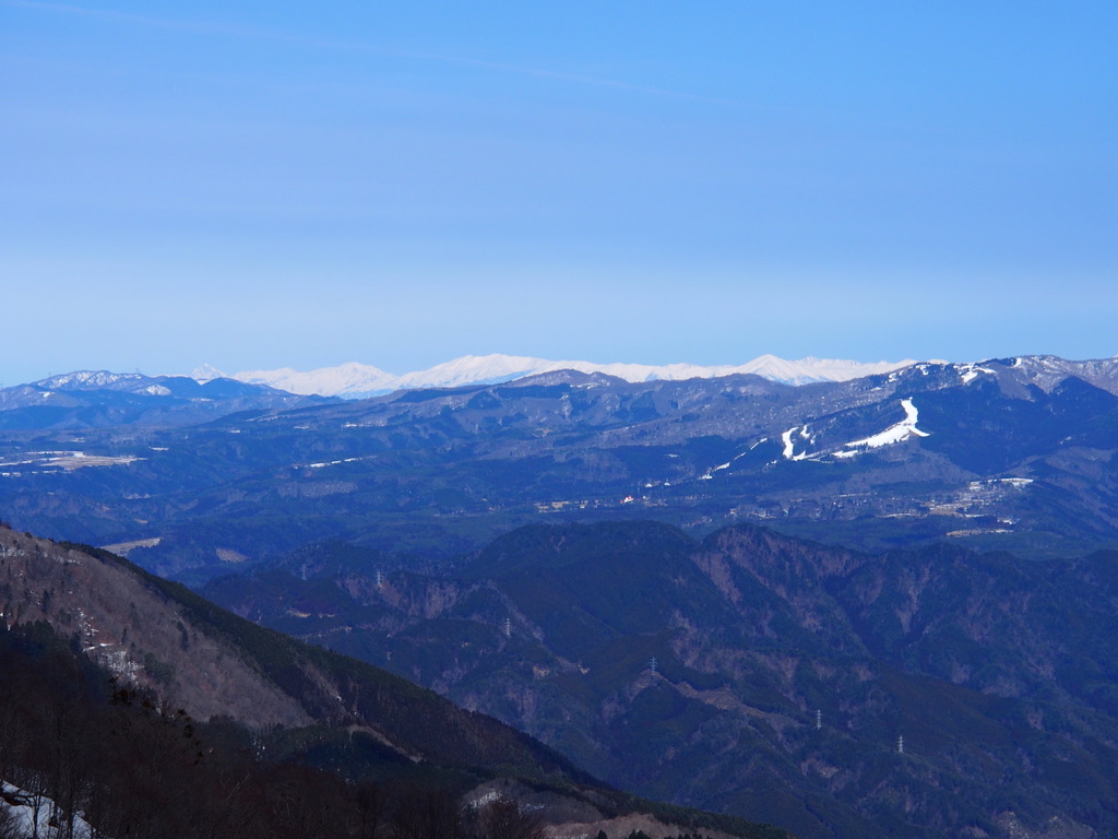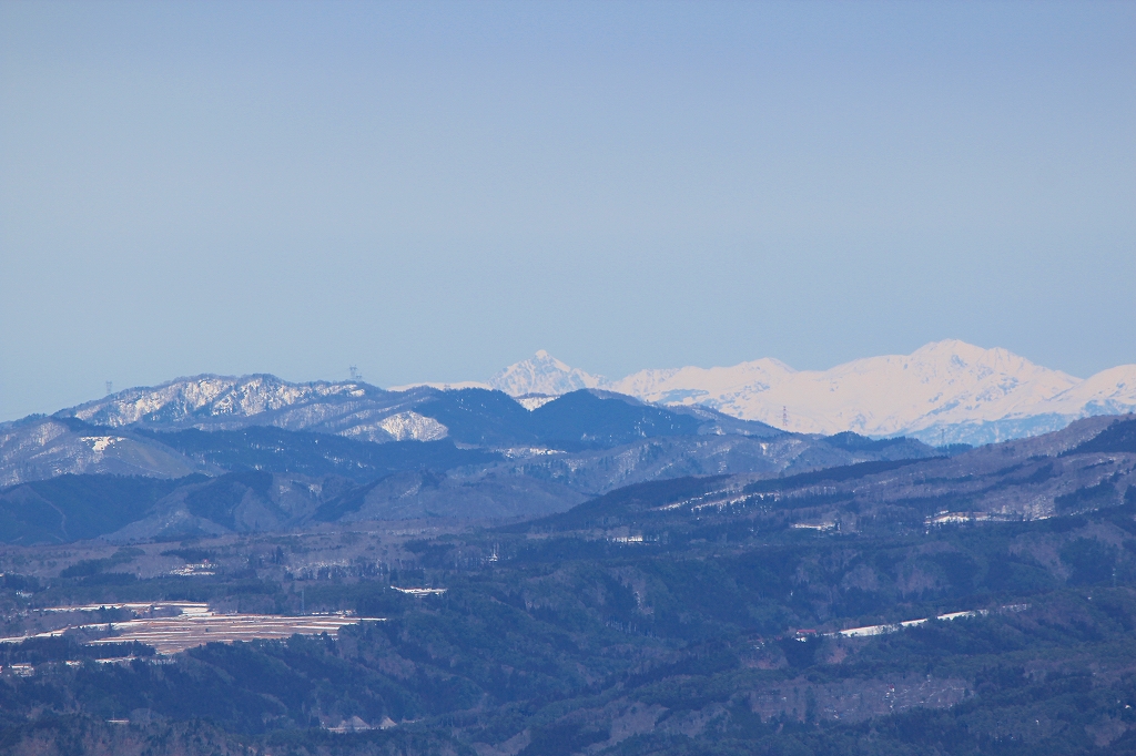 グーさんはここでのランチを主張したが、山頂から少し降った台地状のなだらかなピークがランチ場に決定される。樹間から望む北アルプスは赤樽山から見えていた槍、穂高や笠ヶ岳は鷲ヶ岳の左肩に姿を隠し、その代わりに薬師岳から立山に至る稜線の先に鋭い剱岳が見える。槍ヶ岳と同様に白くないのは急峻な斜面に雪が積もらないからであろう。鷲ヶ岳の右肩には別の純白の山が顔を覗かせている。乗鞍岳だ。