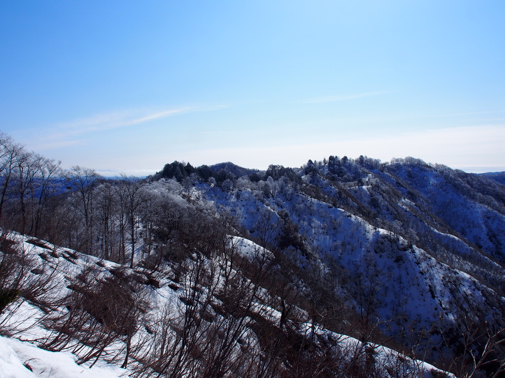 わずかに登るとすぐに南側に展望が開け、蒼穹の下に霧氷を纏った稜線が視界に入ると皆一様に驚嘆の声を上げる。標高わずかに1200m前後の山とは思えぬ壮麗な雰囲気だ。東側にはわずかに雲を纏った徳平山も朝陽に輝いている。