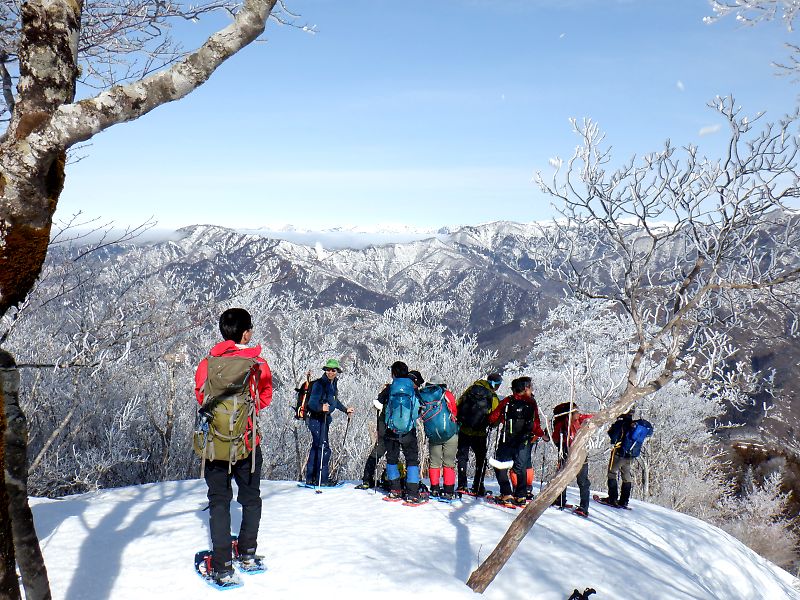 赤樽山の山頂に向かって尾根を登り詰めると霧氷のクライマックスを迎える。雲一つない蒼穹を背景に煌めく霧氷の枝を見上げる。風もほとんどないが、はらりとはらりと霧氷が落ち始める。しかし、山頂にたどり着く瞬間、歓声と共に眺めることになるのは霧氷よりも南側に広がる滝波山から平家岳へと続く越美国境稜線の山々だ。「こんなに眺望がいいとは!」と喜びの聲が各所から聞こえる。