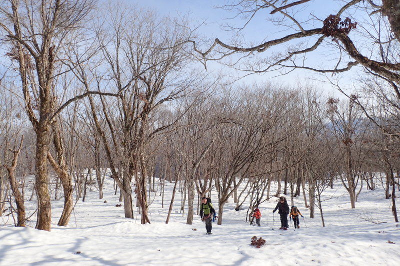 考えてみれば大人数のパーティーでの登山は高校時代のワンゲル部の山行以来だが、隊列を崩して各人が樹林の中を気儘に歩く自由などは考えられない事態だ。思い思いに朝陽の差し込む広々とした疎林の中にトレースを刻んでゆく様はそれだけでも眺めていて愉しくなる光景だ。