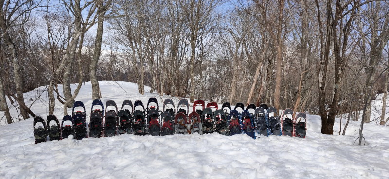 気がつくとスノーシューがずらりと並べられている。同じ色、モデルのライトニング・エクスプローラーが三艘ある。グーさんは好きなものを履いて帰ればいいと仰るが、果たしてスノーシューが持ち主のところに無事に帰るかどうか心配だ。スノーシューを前に記念撮影を行うと、三々五々に下山の準備を始める。