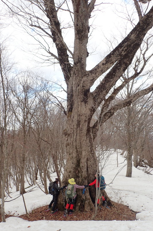 好展望はここで終わり、下山はブナの立ち並ぶ尾根を下降してゆく。やがて遠目にもそれとわかる大樹が尾根の中央に現れる。これが噂のミズナラの大樹のようだ。樹の中には洞が形成されており、その中を覗き込むとまるで祠の中に祀られたお地蔵様のように氷荀が鎮座しているのだった。長い氷荀の一本が折れてしまっていたので、立て直してみる。