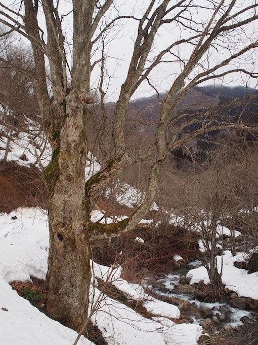 再びスノーシューを装着して九頭竜川を見下ろしながら林道を歩くと「3年前にこの山を辿った時はあそこを渡渉したんです」と山日和さんが川面を指差す。川を見るとどう見ても容易に渡渉できるようなところではなく、膝まで水に浸かることは免れそうもない。当時の地図にはこのあたりに橋が記されていたにも関わらず、実際には橋がなかったらしい。改めて情報の少ない山のルートを開拓して来られた山日和導師の苦労を垣間見る気がした。