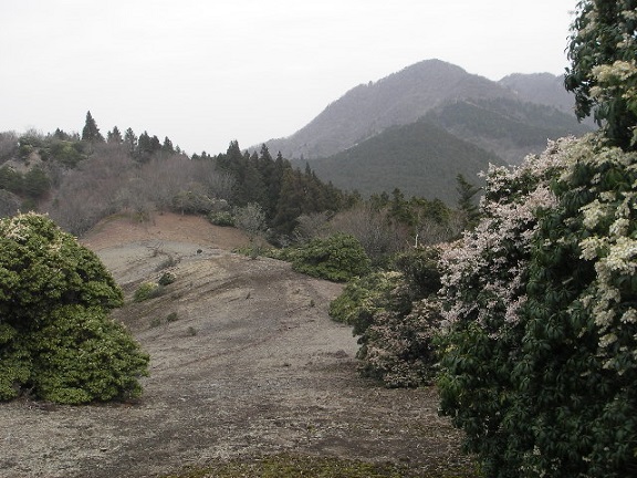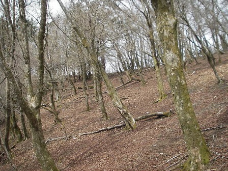 県境稜線に出る手前は鈴鹿南部にしては珍しい落葉樹の疎林が広がって気持ちいい場所だった。