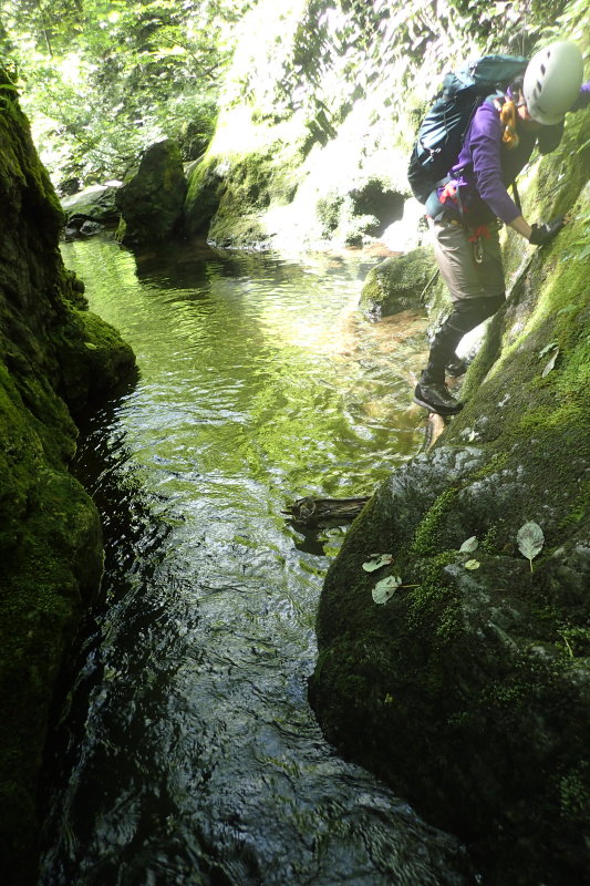 かわいいミニチュアゴルジュ。淵は足が届くかどうか。左側をそろそろとへつる。流木に助けられ通過。