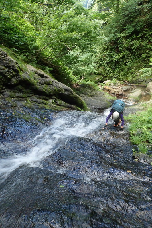 次々と現れる小滝にわくわくどきどきしましたが、核心部のナメ滝、斜瀑の素晴らしさには目を見張りました。