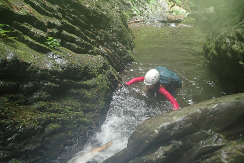 ちいさなゴルジュが現れた。腰の上まで浸かりそろそろと通過する。