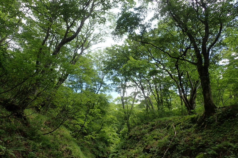 あたりはうつくしいブナ林となり、右に流れが見えた。下る予定だった谷だ。