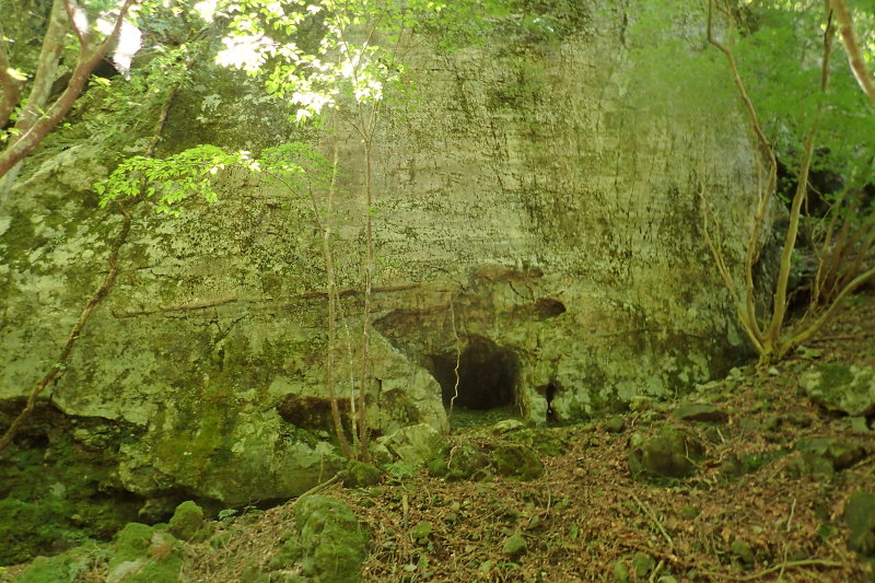 地形図から想像するよりはるかに広く明るい谷だが、さらに大きく開けると左岸に目を瞠るような大岩が現れた。岩壁ではなく、独立した巨大な岩がいくつも続き、その中に人工的と思われる穴が穿たれた岩があった。お不動様
