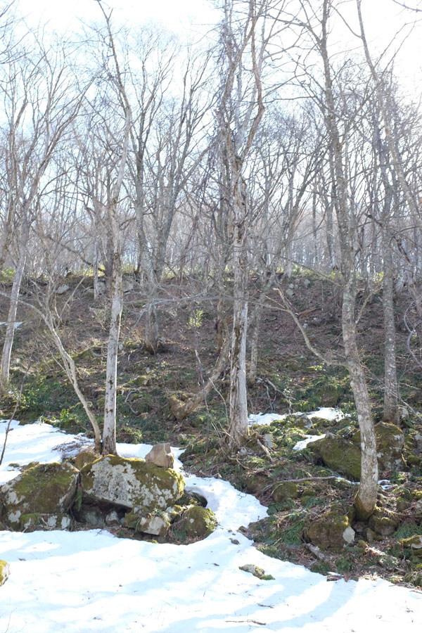 杉山トンネル南側にある駐車スペースに車を停めさせてもらって登り始めると、急斜面な斜面の中に石積みと杉林。