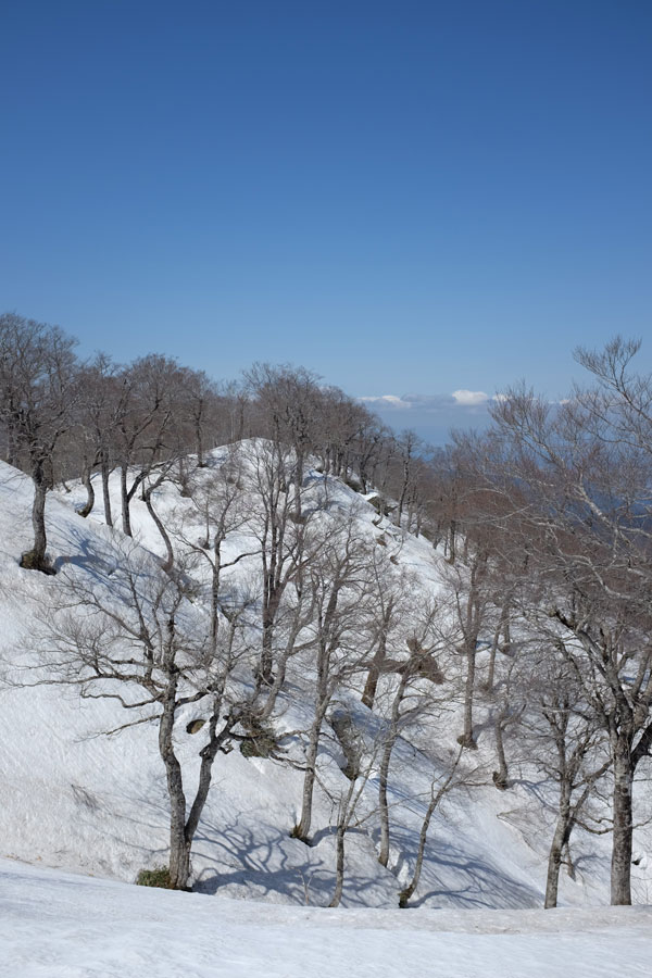 あたり一面は若いブナと薄い笹原で、奥美濃辺りの歩きやすいあたりとよく似た雰囲気です。