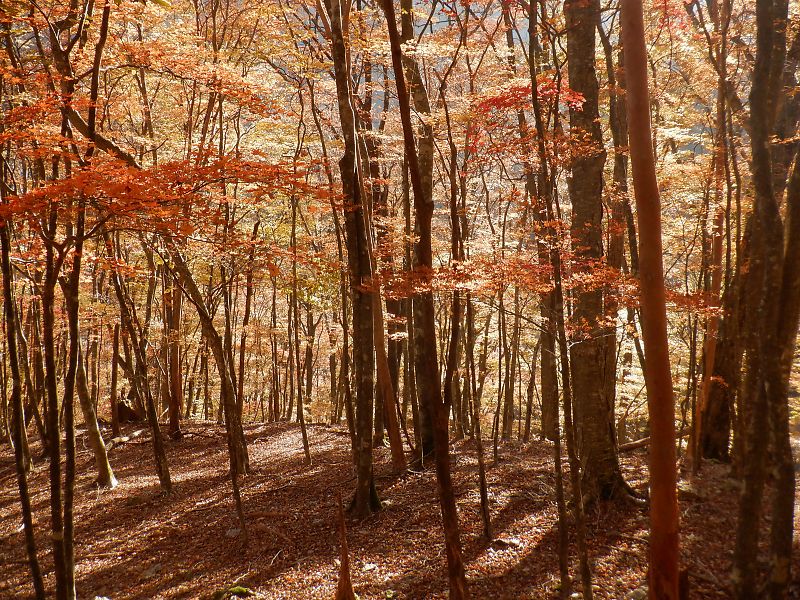 シャッポ尾根の北斜面の紅葉は日陰になっていて絵にならない。ボンサイ平からの桧塚北面も陰になって絵になりませんでした。