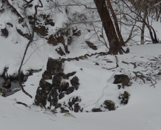 沢側には石垣が確認できます…が、雪に埋もれていました。