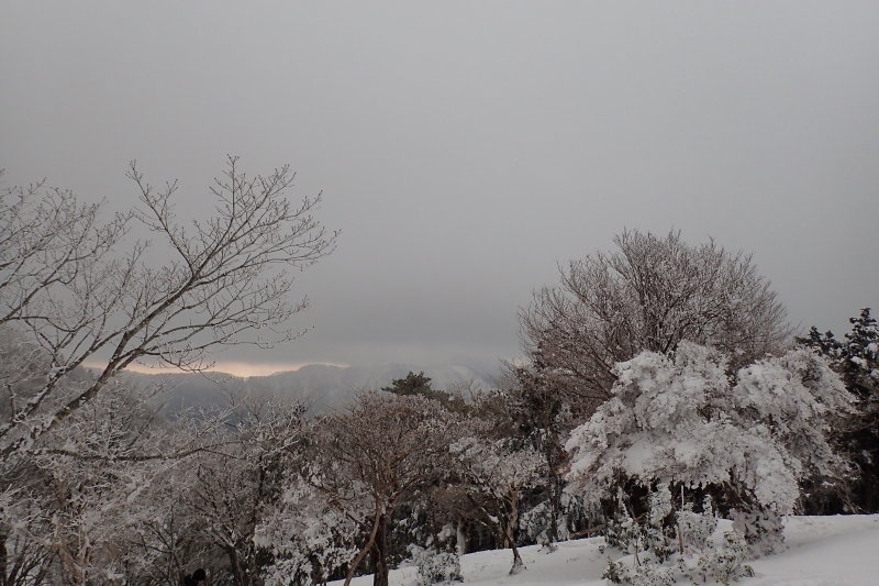 霧氷のない赤ゾレ山はパスして伊勢辻山へ向かう。振り返ると国見山から南はしっかり霧氷ができているようだ。山の