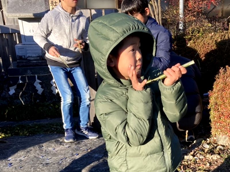 メダケの筒にリュウノヒゲの実を詰めて飛ばす遊びです。