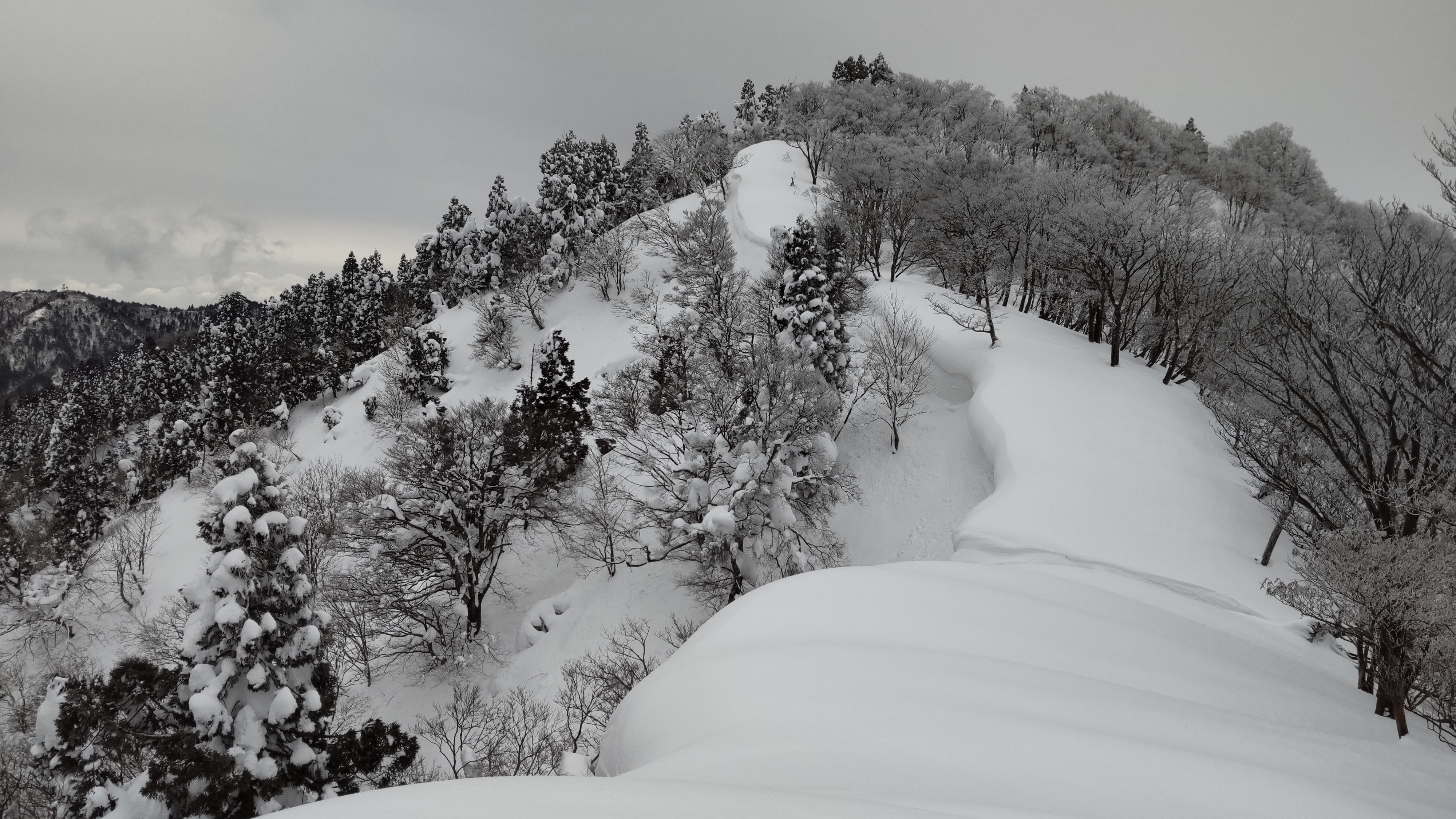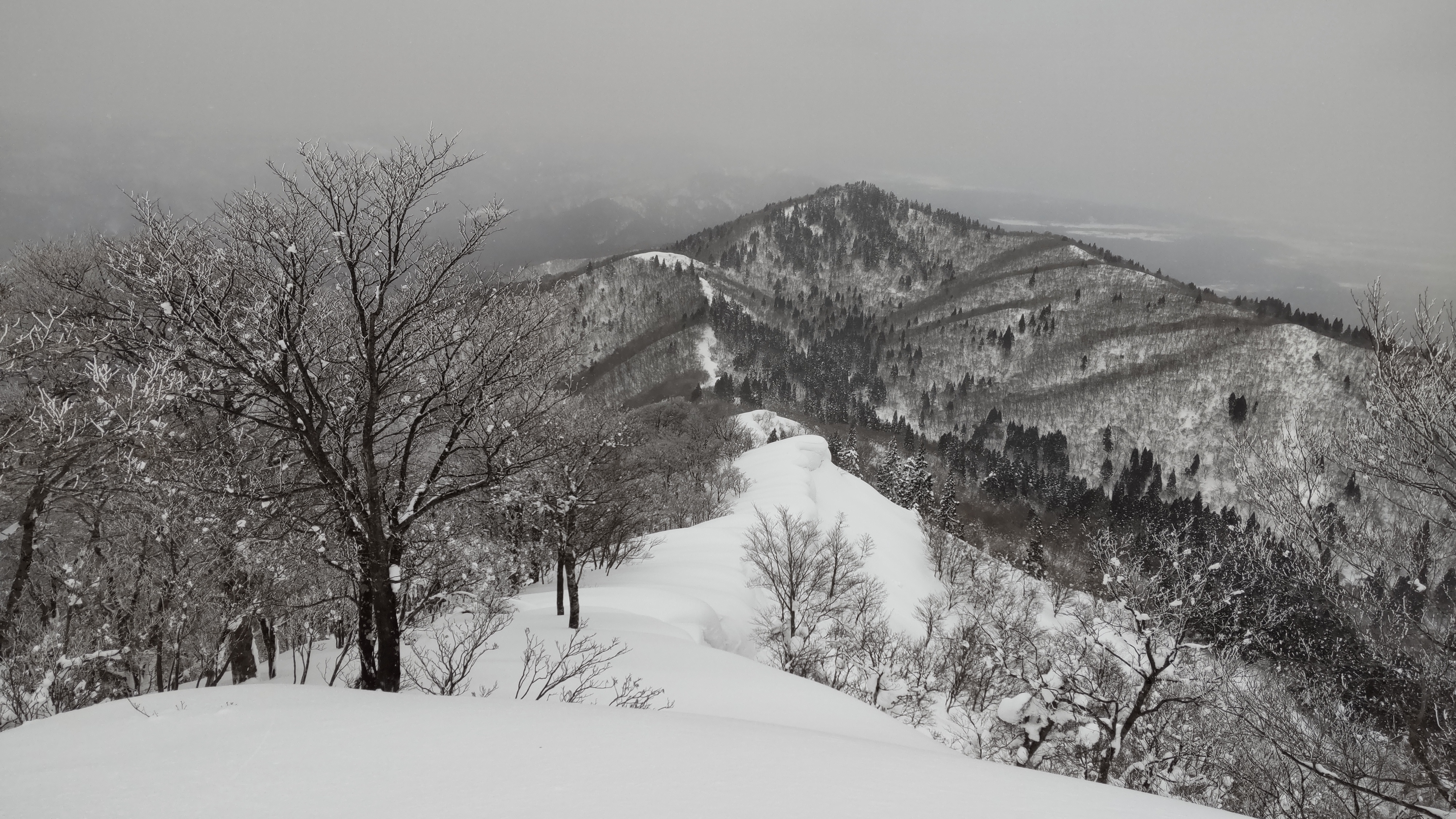 霧氷のブナの木立を抜け、世界は鉛色の空と白い雪面の二色に。