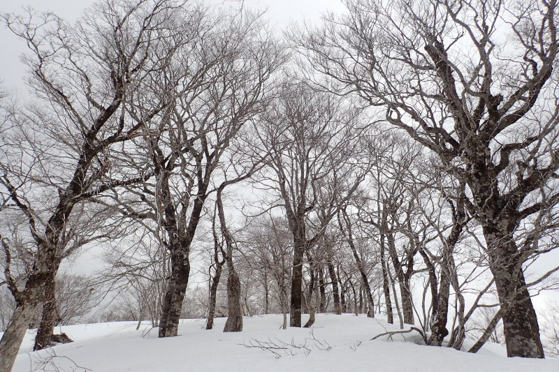 老練な雰囲気の巨木たちですね。急登が終わって東西に長細い山頂台地の一角に立った。ここからはまたブナの森が始まる。