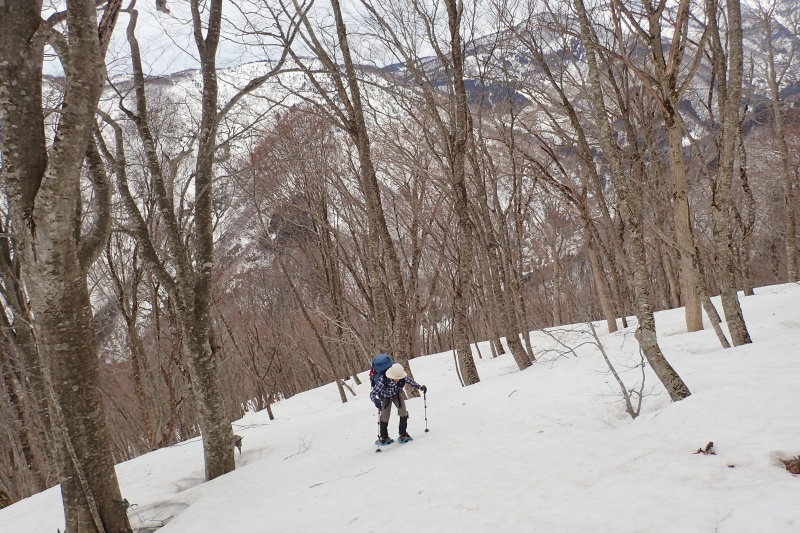 を切ることもなく一直線に登って行く。湿り気を帯びた重い雪だが、締まっていればスノーシューのフレームが
