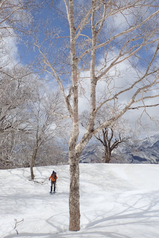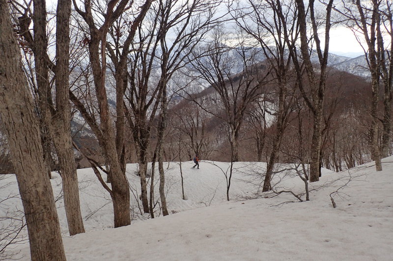 往路と反対向きの展望を楽しみながら下って行く。雪は少し腐ってきたようだが、そうでもないところもあり、