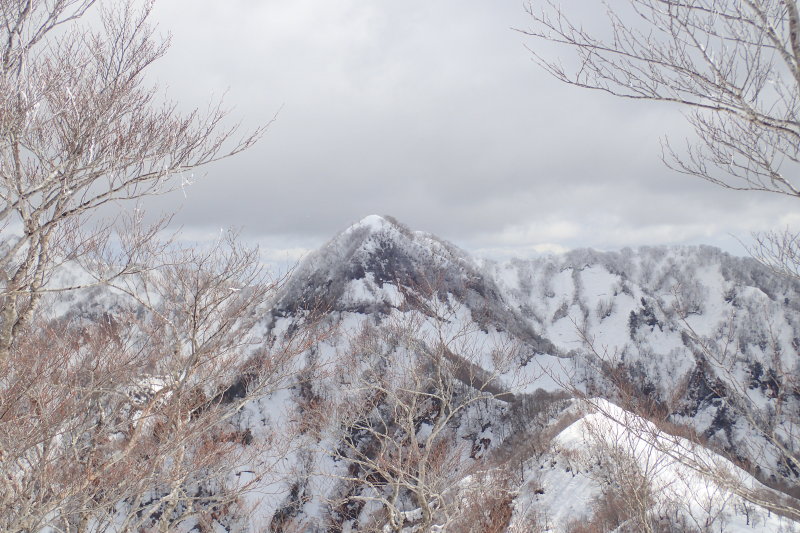 どんぐりのような枇杷倉山の鋭鋒は人を拒絶しているような佇まいで、松鞍山へ続く稜線は取り付く島もないよ