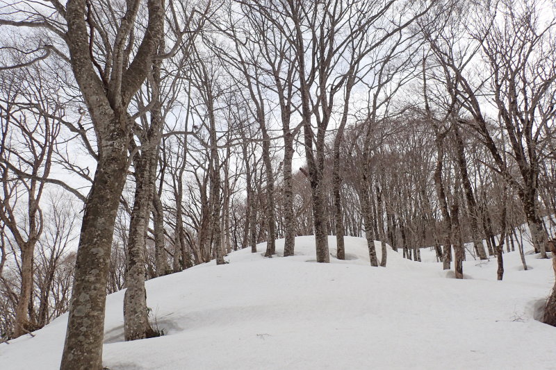 急登が終わって東西に長細い山頂台地の一角に立った。ここからはまたブナの森が始まる。