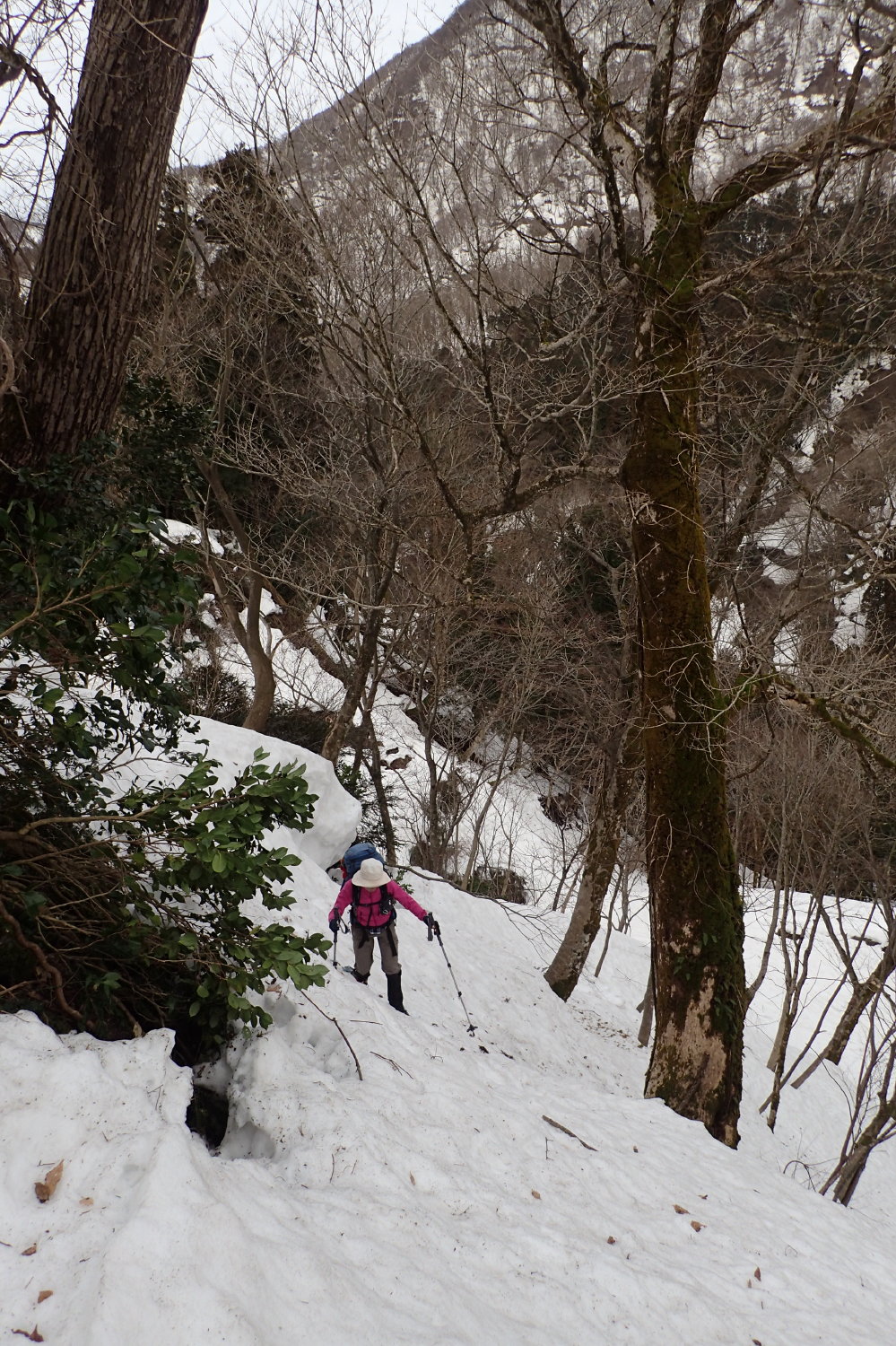 た。尾根芯にはそこはかとなく踏み跡があるようだ。その踏み跡を利用したり、雪の上へ出たり、左手の谷の雪