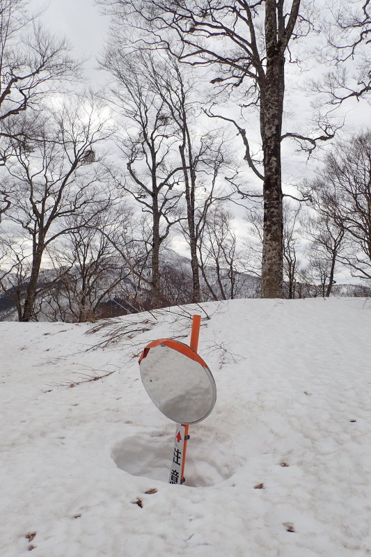 967m標高点の手前で林道に出会う。鏡の部分だけ頭を出したカーブミラーがなければ林道だとは気付かないか