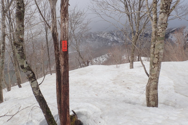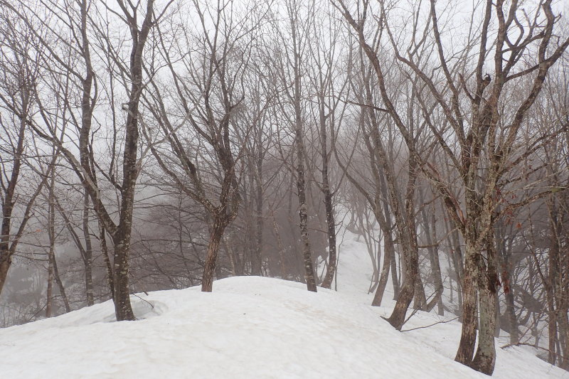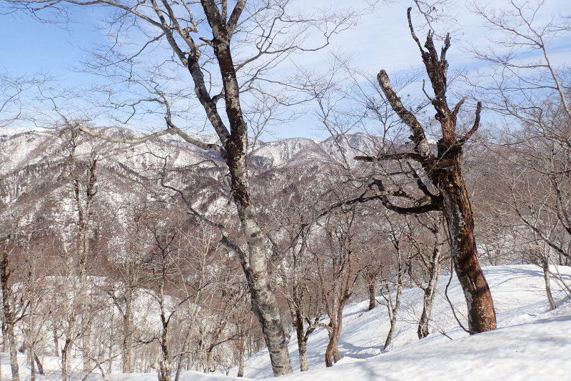 意外なほど展望のいいブナ林の尾根が続き、足取りも軽い。南側斜面には雪の台地が広がり、緩やかに上がって