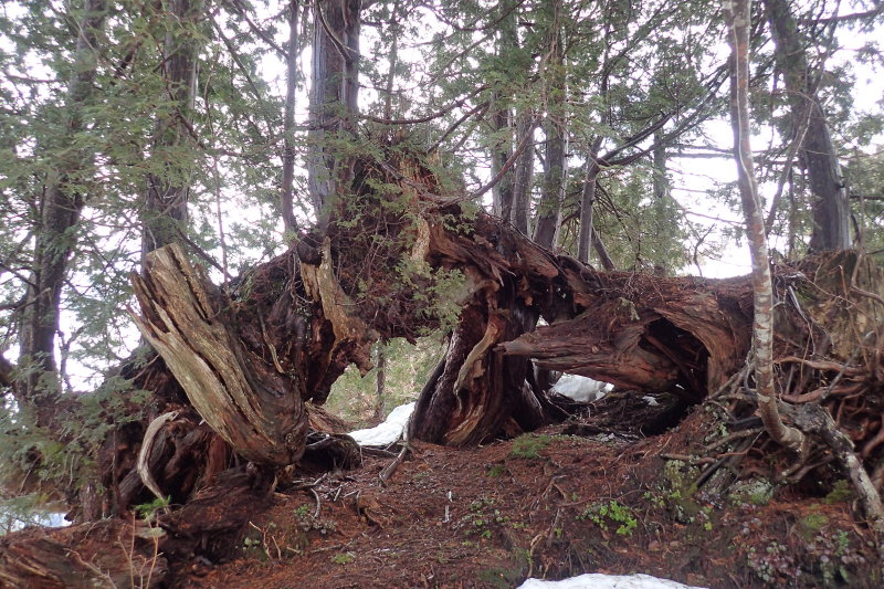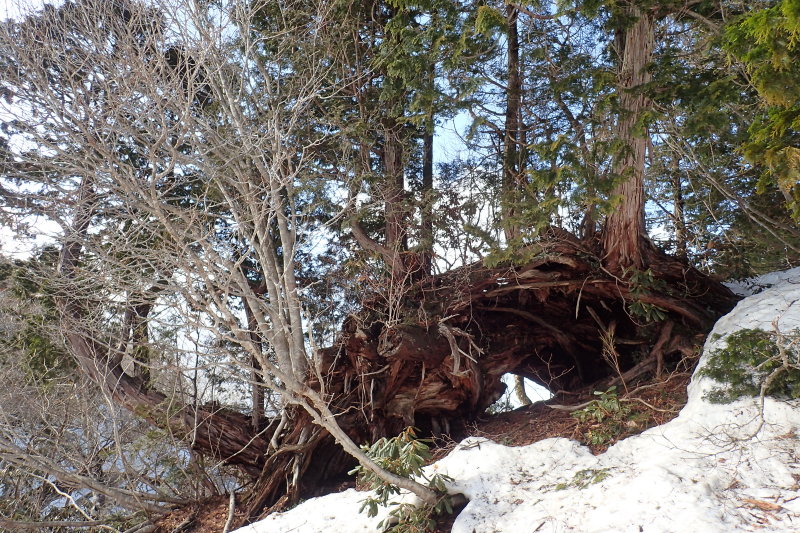 主稜線に突き当たって右折すると、尾根を塞ぐヒノキに度肝を抜かれた。両足を踏ん張ったように立つ根上が
