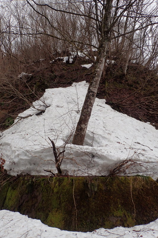 その先は松鞍山や岩谷山でもあったように、地肌が出ているところと 高い雪堤が残っているところのギャップが大きいですね。
