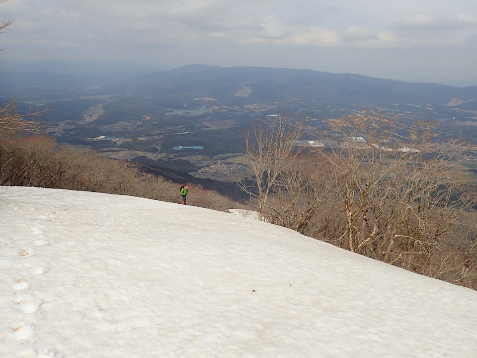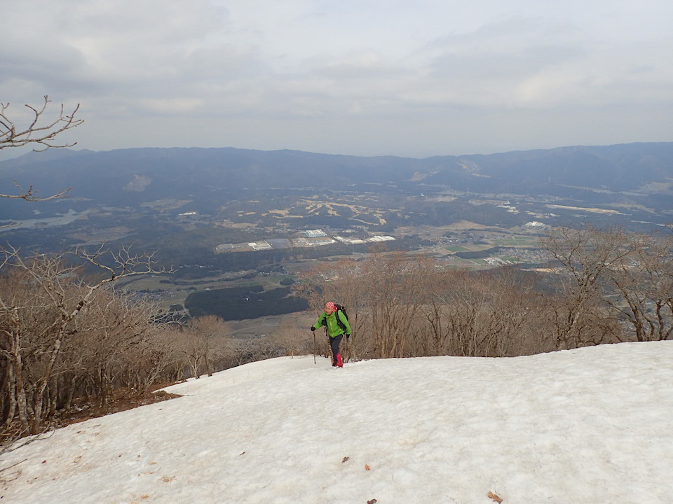 傾斜のきつい所では雪のない尾根芯に移ったりしながら登る。