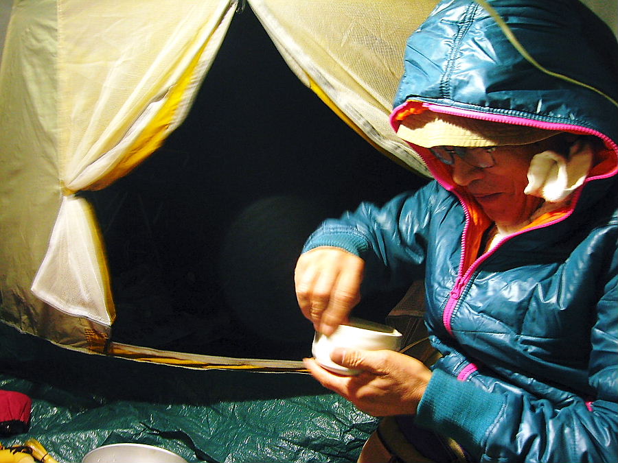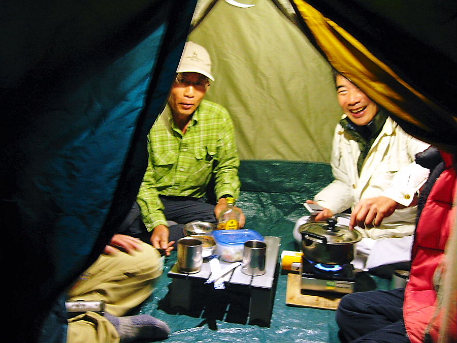 パラボラ跡に物資上げるは大変だということで、峠車の傍で宴を張りました。