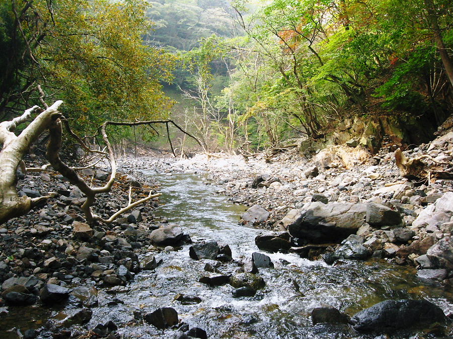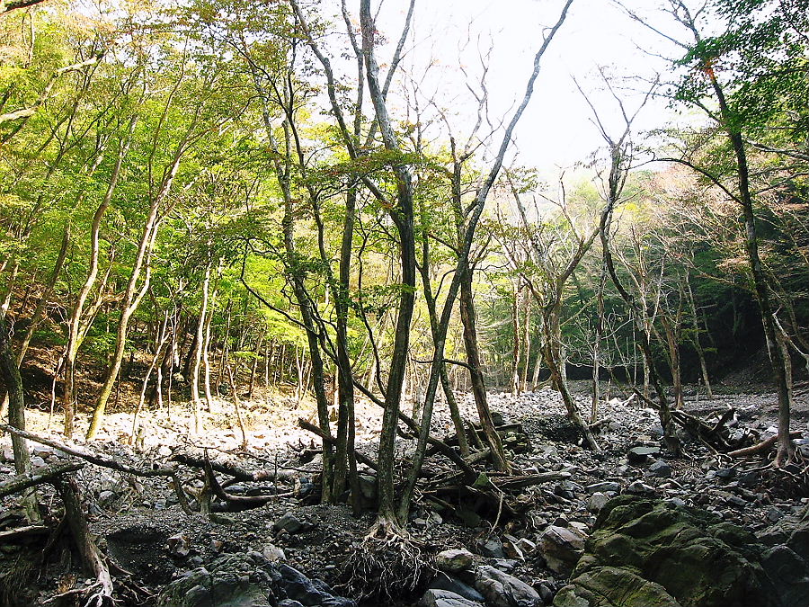 鈴鹿十字峡は土石流で埋まり立ち枯れが河原中に立つ。