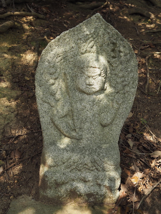 次の小ピークca210mから西側に三角点ピーク△172.8mを目指して尾根を下ると、すぐにも忿怒の相の不動明王の石仏が現れる。こうした道中の石仏としてはかなり珍しいだろう。