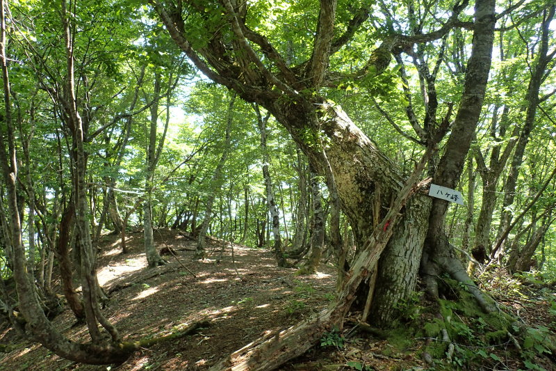 最後は気持ちのいい自然林のグリーンシャワーの中を若丹国境稜線に飛び出し、一投足で八ヶ峰の山頂に到着。