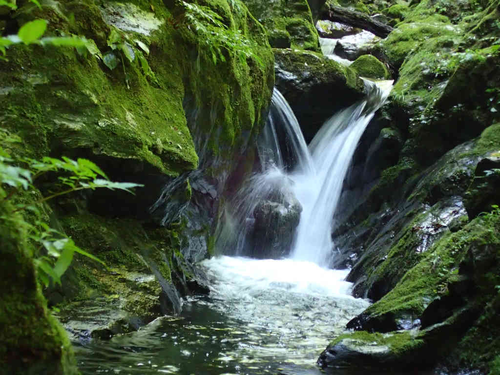 ロープを出すような大きな滝はないが,いかにも台高の谷らしい苔むした岩の間を流れ落ちる白い流れに身をおいてボルダリングチックなムーブで2,3m程度の滝を登るのも楽しい。滝ではなくても,清流に足をつけて歩くだけでもまた楽しい。周囲はチドリノキやサワグルミなどの落葉広葉樹の森。出会いから1時間ほどで奥山谷を代表すような5m2条の滝。