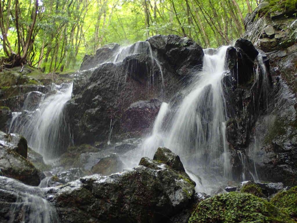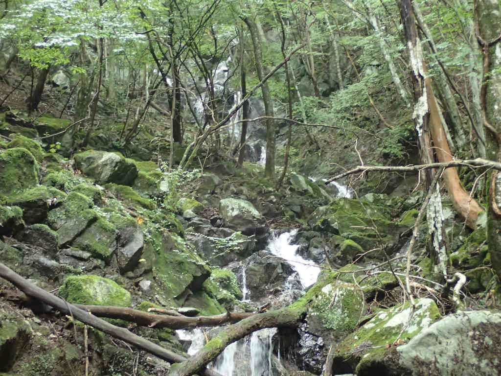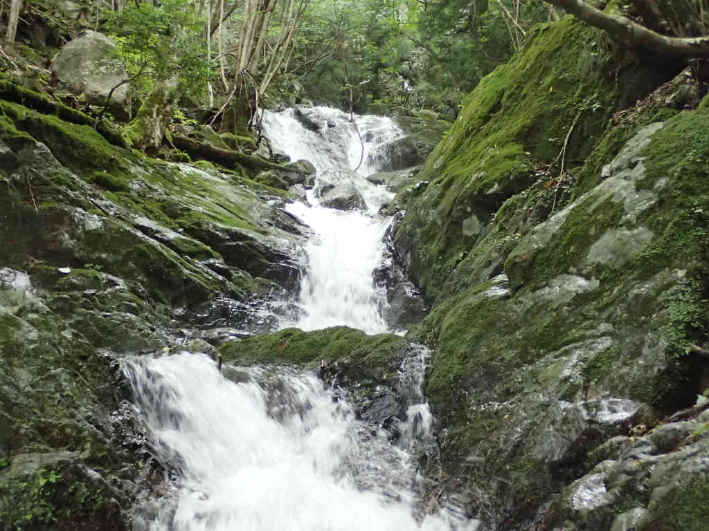 水の感触を確かめながらゴーロを10分ほど上がると第一連瀑帯のお出迎えである。一見こんなところを登れるの?と思うような滝群であるが,取り付いてみるとホールドやスタンスが豊富で,しかもフリクションがいいので面白いように登ることができる。滝の一つ一つは数mクラスだが,それらが連なっていて全体で50mほどの落差になるだろうか。水量が多くいつもよりは難度がやや上がっており,単独行なので絶対に滑落は許されないという緊張感もあって,三点支持を守って確実に登っていく。 第一連瀑帯を過ぎてほっと一息。ああ,面白かった。10分ほどゴーロを登ると,このコース中唯一直登できない8m滝。やはりいつもよりもずっと水量が多い。右側のルンゼを登り,途中からバンドを伝ってトラバースすると落ち口に出ることができる。落ち口でちょっと休憩。ここまで登山口から約1時間。 この後もナメ斜滝や数mクラスの滝が続き,飽きることがない。その全てがロープを使わずに直登できるので面白くてしょうがない。中だるみもなく,こんなにずっと楽しませてくれる谷なんて滅多にあるもんじゃない。1時間ほど滝と戯れる。最後の滝を登るといきなり癒しの源頭部である。今までの滝づくしの谷がいきなり平流に変わる。周りはオオイタヤメイゲツ林である。