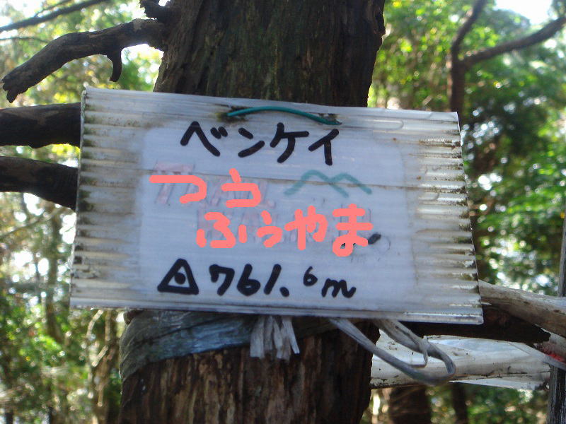 ベンケイ山頂は展望もあまり無いが、そのかわりに、まるで名古屋の錦三丁目あたりの雑居ビルに段々に懸かるスナック、バー、の看板のごとく山名表示が5~6枚。マイナーな山ほどこういう状態が多いと思うが・・・・・。ちょっぴり苦笑い。