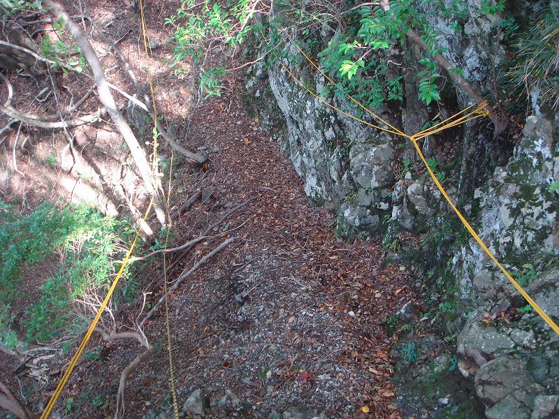 どんどん踏み跡がはっきりしてくる。620mあたりで思ったとおり一気に崩壊しかけた谷を右の尾根にトラバースし始めた。なんとそこには初心者の登山者を意識するかのように丁寧な残置ロープがこれでもかと何箇所も何箇所も設置されている。尾根のもろい場所にはいたるところに設置されている。