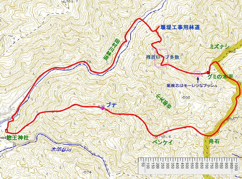 【 ルート 】惣王神社8:55—9:55弁慶ブナ(仮称)10:04—10:30ベンケイ—10:50舟石10:55—11:15小太郎谷源頭カール—11:33御所平南端11:48—11:52グミの木平12:26—12:50トラバース地点—13:18堰堤工事用林道をさまよう—13:31田村川林道—14:08惣王神社