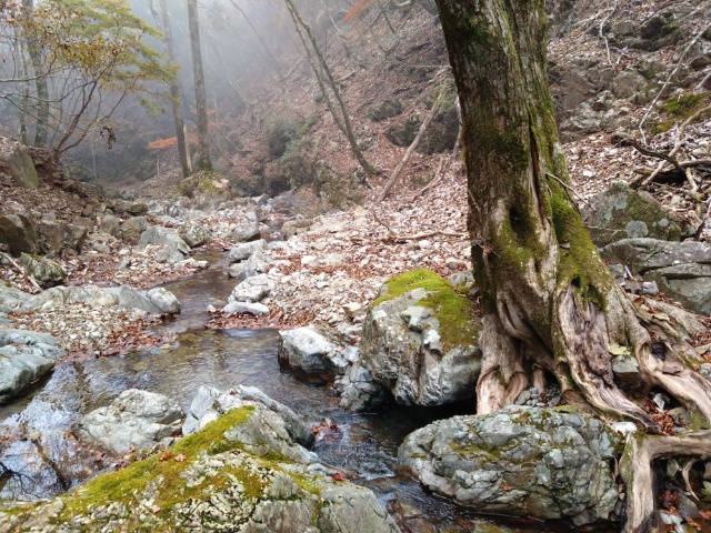 (ここには道型がありました。私でも考えること、動物や昔の人はとっくに考えてた。)いちばんのゆるいところで八町滝上流の右俣に降りた。