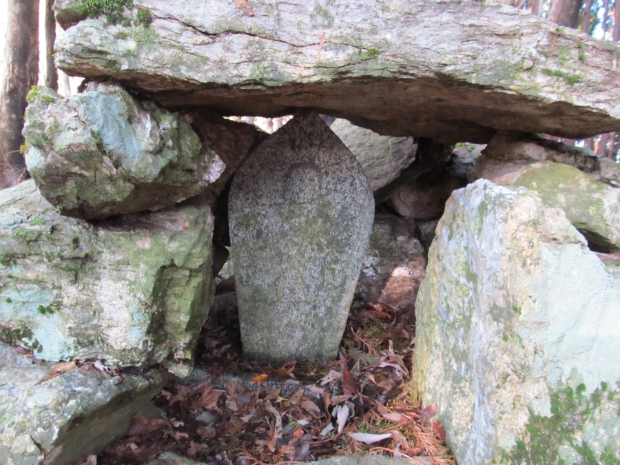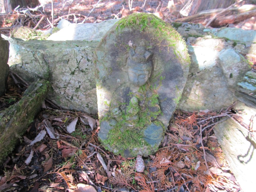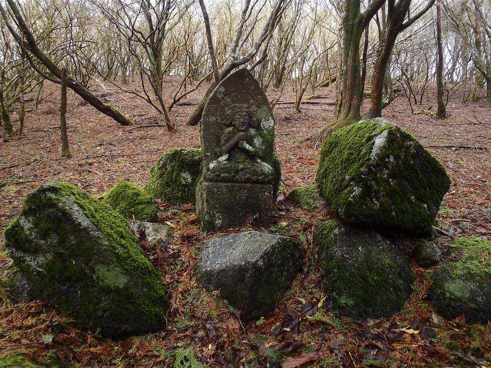 自然林帯に入ってトラバースしながら稜線沿いに進む、見下ろす山腹は自然林がずっと続いてる様だ、多いのはミズナラかコナラか判らないけどナラの木が多い、あちこち歩いてみたい様な所であった。自然林は有っても稜線に僅かだろうと思ってただけにうれしかった。シイタケでも生えていそうな所でゆっくりキノコ探しでもしたいが先が長いので長居はできない、また改めてこようと稜線に上がった。上がったピークがP845、ここには大日如来、八大竜王の石碑と、一体の石仏が点々と散在して祀られていた。山名プレートもないので気づかなかったが帰ってわりばしさんのレポを見直したらここが帝釈山だったのだ(^^;で石仏は帝釈天かと思ったら弥勒菩薩だって、なんでやねん。