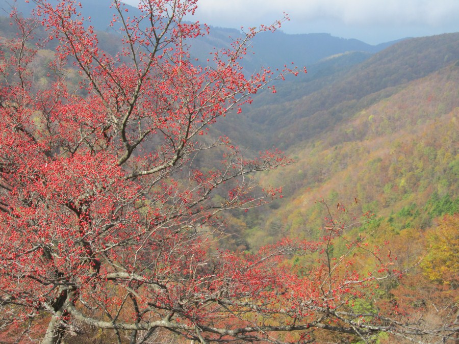 シロヤシオも見られるようになると木梶山に到着、フクロウの切り取られたプレートを撮影いていたら釣り尾根方向から単独男性がやってきたが木梶林道に下る様で素道りしていった。私も吊り尾根に向かい昼食とする。ガスで寒いので長袖のシャツを羽織る。かなり木々は色付いてきているが、ガスが景色を見え隠れさせている、食事をしているうちにガスが取れだしゼイノ谷の彩りも見られたのはラッキーだった、今年はカマツカの実付きが良いようで紅葉の悪さを補ってくれてるようだ。