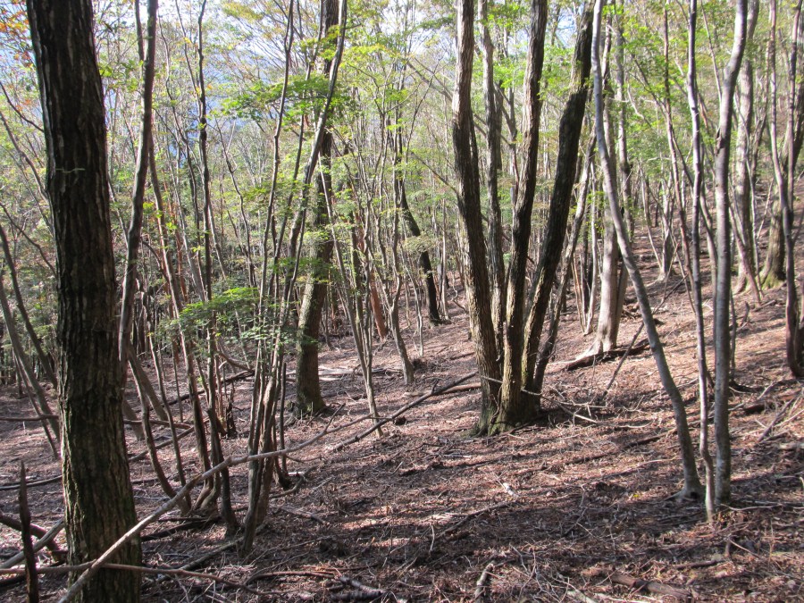 P845を過ぎると南面下に等高線の開いたコバ地がある様だ、地形図を眺めて気になっていたのだけどおそらく植林なのだろうと思っていたが現地を見ると自然林も有るようなので降りてみる