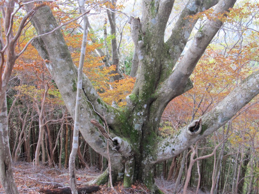太いミズナラを眺めながらすすむ左手には菅谷右又源頭部の穏やかな谷が上がってきている、ここには綺麗に色付いたもみじが数本、目を楽しませてくれた。