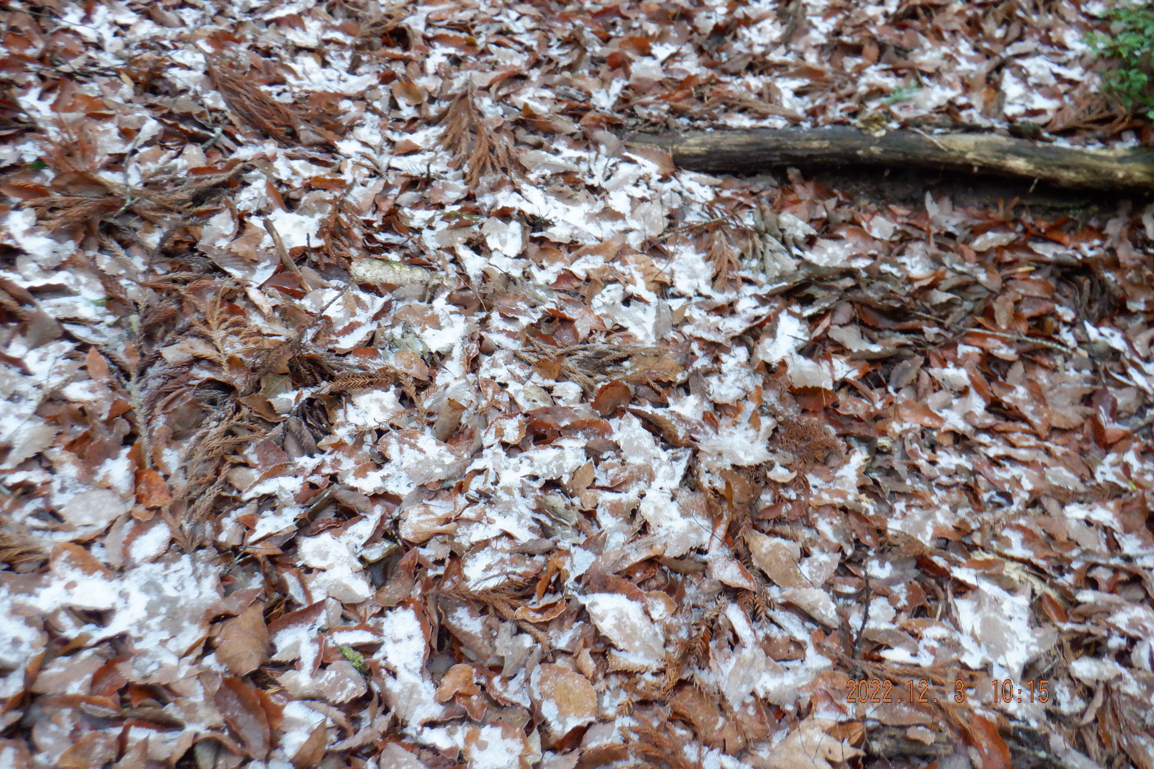 途中に霧氷の欠片のようなものが落ち葉に付いていた。
