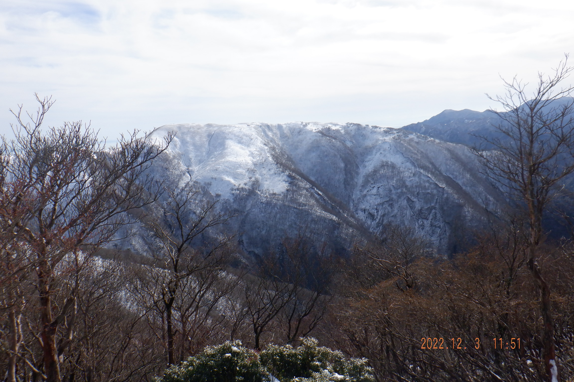 900m辺りまで登ると左手の斜面が霧氷で白く輝いていた。その奥には孫田尾根が見えた。