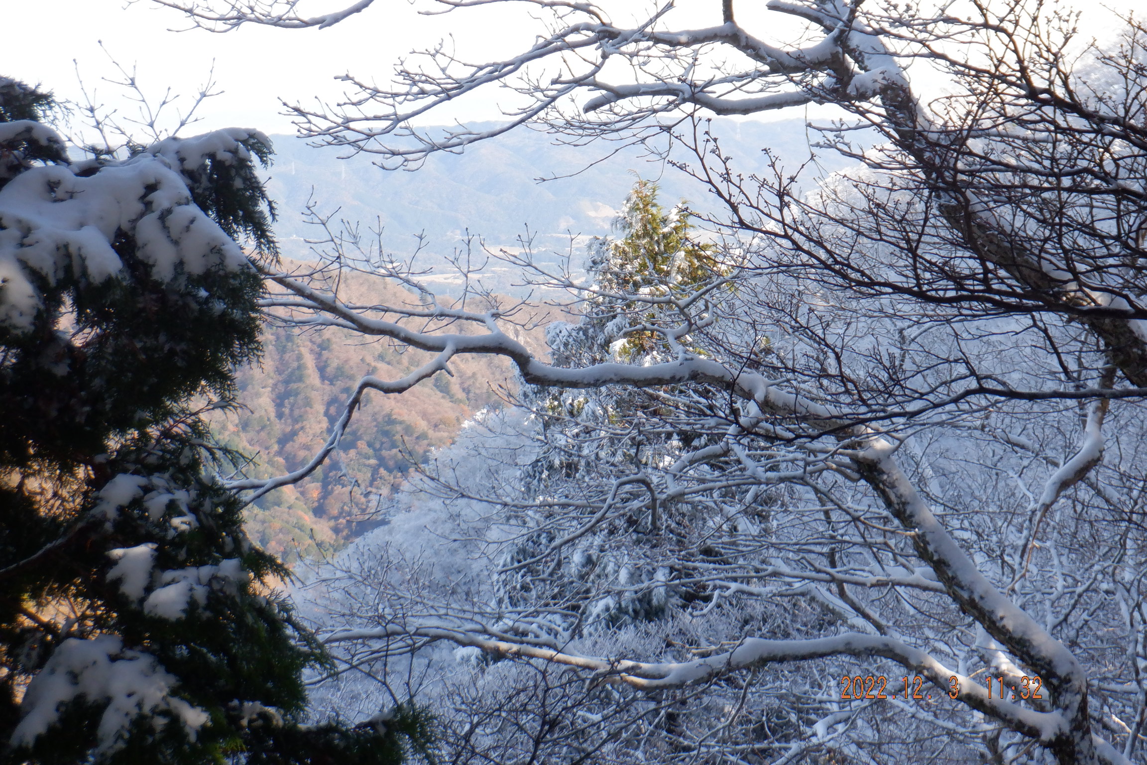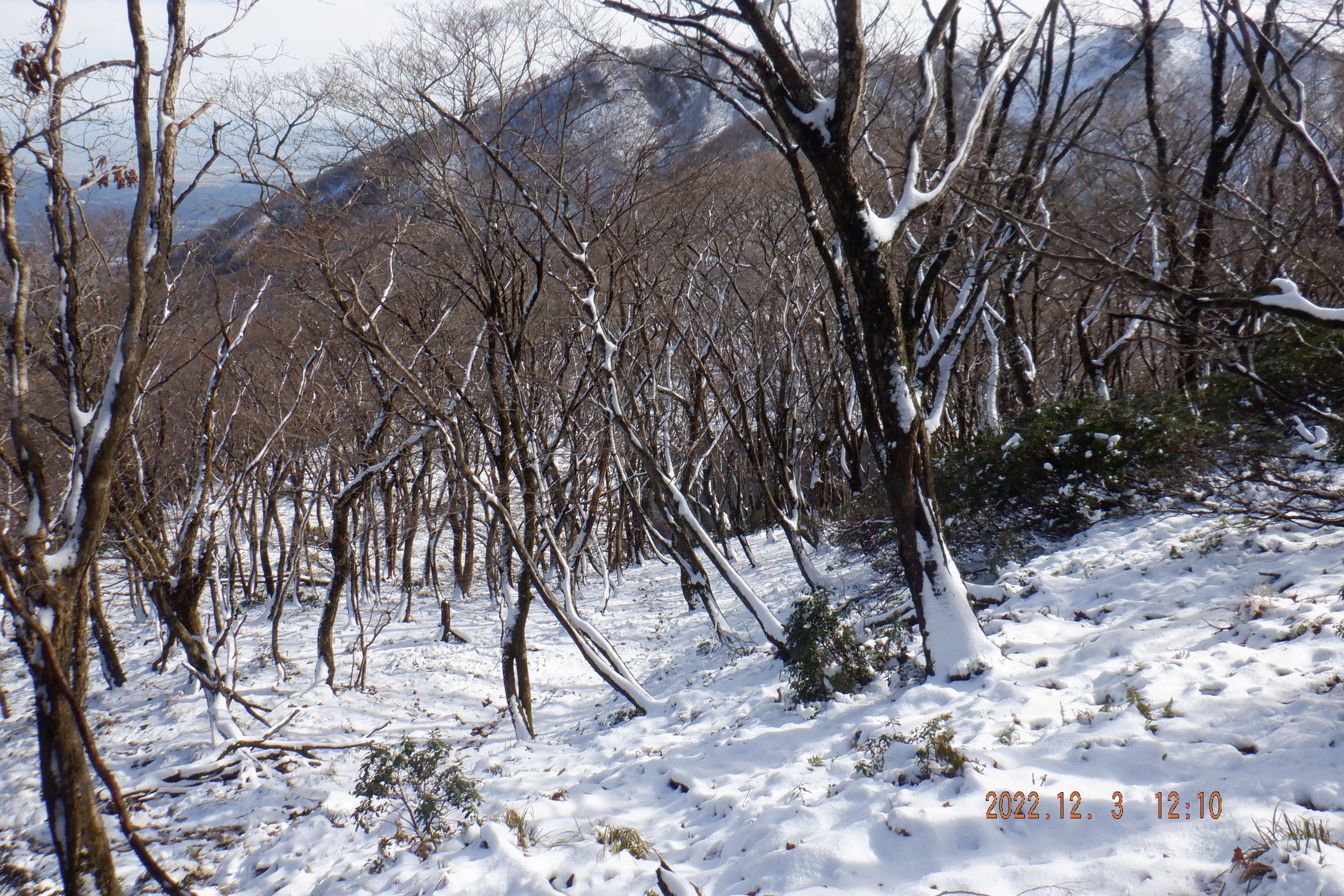 尾根の中腹まで登ると地面が白くなって来て、木々にも雪が付いて来たので雪山気分であった。