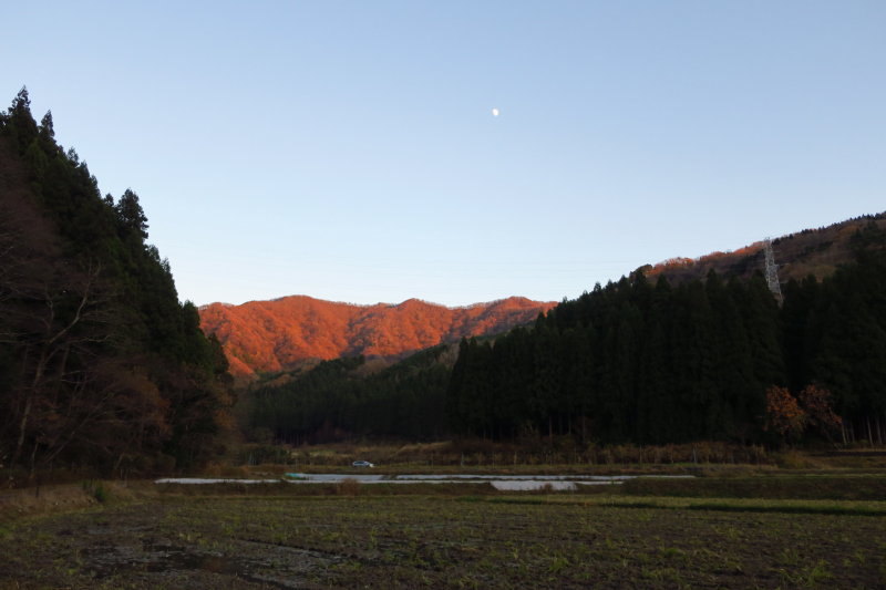残照を浴びて赤く輝く山やま、その向こうに、しんとした静けさでそびえ立つ国境の山やまを眺めながら、日本の里山歩きのしみじみとした味わい深さをかみしめていました。