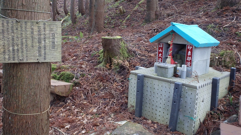 祠がある峠に出て一休み。山頂から50分ほど。まあこんなもんか。そのまま登り返せば桜谷山だが、今回は素直に左の上根来への道を下る。谷筋の水場を過ぎ、トラバース気味に尾根に出てすぐ、標示に従って右の谷筋へ下っていく。